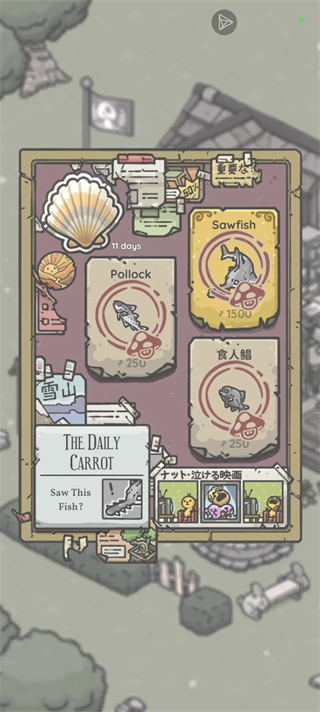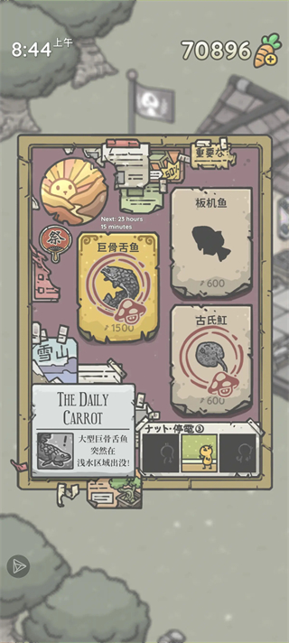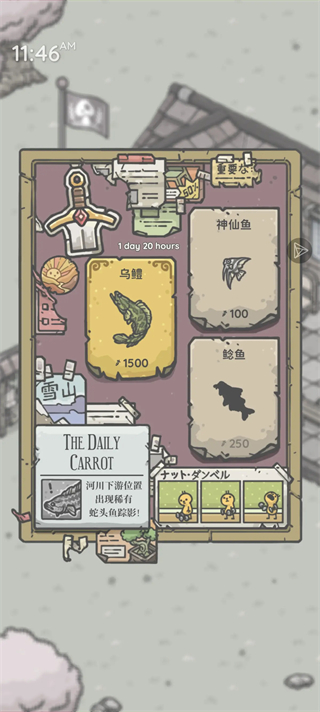 从晨光熹微到星垂平野,蘑菇村水域暗藏玄机——伊氏石斑鱼(09:50 码头)、乌鳢(11:45 冬安工具店)、巨型鲶鱼(11:26 冬安工具店)、双髻鲨(14:09 码头)、虎鱼(16:18 冬安工具店)、蓝枪鱼(12:48 码头)、蝴蝶鱼(11:20 萝丝花店)、沙虎鲨鳍(08:45 码头)、锯鳐(18:30 萝丝花店)、龙王(20:02 码头)、巨骨舌鱼(08:41 冬安工具店)。每一条都是专属于你的时空彩蛋。
