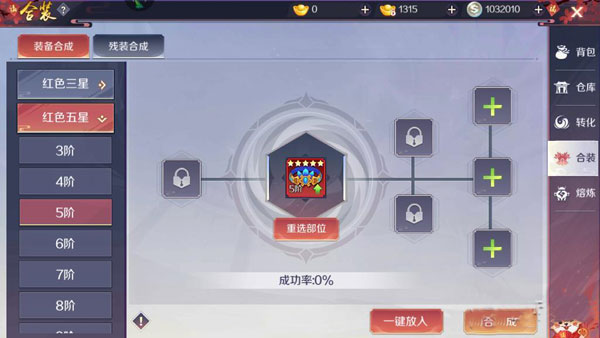 • 善用「合成」功能——红三星装备100%成功率合成红五星,属性质变起点;