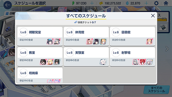 日程表协力 1. 主界面点击咖啡厅旁日历图标进入日程表; 2. 选择目标学院与教室,即可与该场景关联学生进行专属互动,稳固关系同时推进学院剧情。
