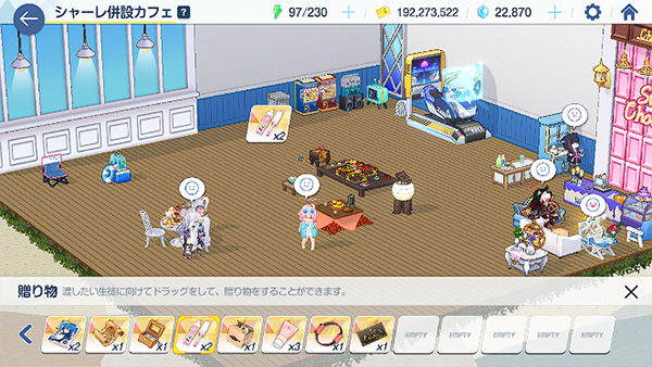 咖啡厅互动 1. 主界面点击左下角茶杯图标进入咖啡厅; 2. 点击头顶带黄色感叹号的学生头像即可完成基础摸头互动; 3. 点击下方礼物按钮,选择对应喜好礼品赠送,不同表情反馈对应不同好感增幅(详见后附数值表)。