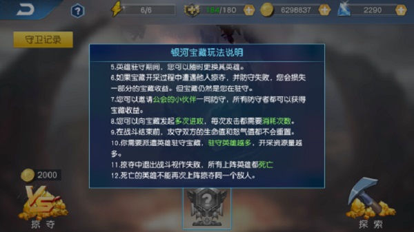 银河宝藏系统——公会协作新高地 开放式资源争夺玩法!进入「银河宝藏」地图,可自主抢占金矿、晶石矿、经验矿三大资源点;驻守英雄越多,产出越丰厚;支持邀请公会战友协同防守,亦可发起掠夺挑战他人据点。精英矿场限时开放,高风险高回报,顶尖战力的试炼场!