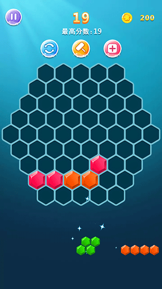 六边形消除:突破方形限制,支持横向、左斜、右斜三向连线消除,自由度拉满,考验空间预判能力,备选方块无处安放即为终局。