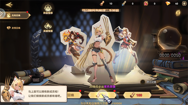 先知召唤,保底机制友好 常规召唤稳定获取人族/精灵/龙族三系英雄;20抽必得紫色品质英雄,无玄学压力,资源投入看得见回报,平民玩家也能稳步组建核心卡组。
