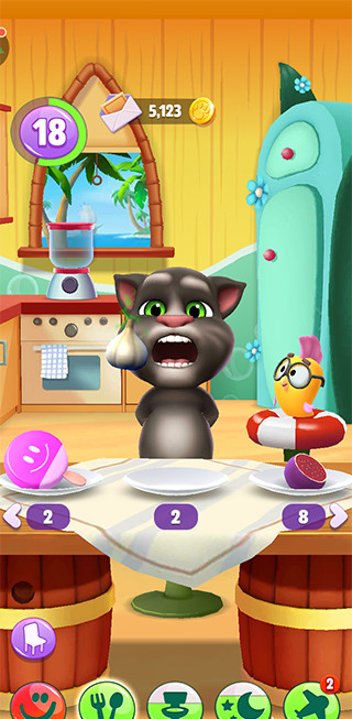 拖动食物至汤姆嘴边即可投喂:辣椒触发“喷火特效”,大蒜引发“臭气熏宠”彩蛋,不同食材激发专属动画与声音反馈——既是养成,也是一场充满未知笑点的实验。喂对了,他摇尾巴蹭你手心;喂错了,他翻白眼甩头走开……真实感,就藏在这些细节里。