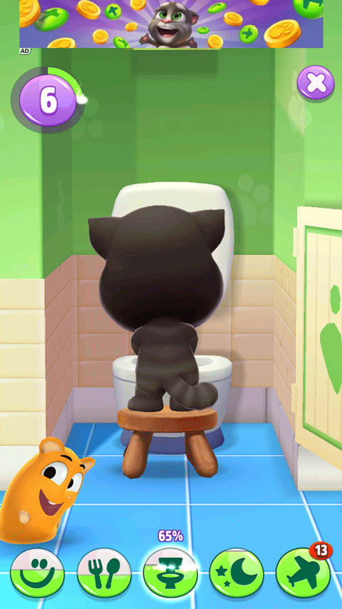 6、进食过量将触发“急需如厕”状态,点击浴室马桶图标,观看汤姆猫憨态毕露的自主清洁全过程;