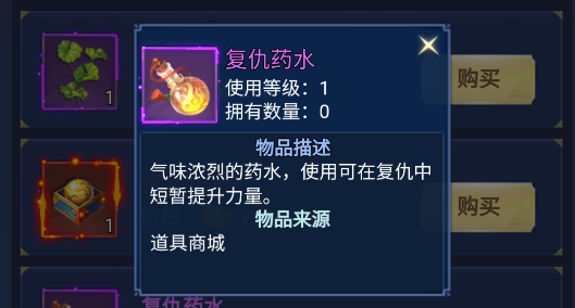 气味灼烈、药性暴烈的秘制丹液,饮用后可在复仇副本中短暂激发潜能,大幅提升战力,助你一击雪耻、快意恩仇。