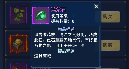 盘古开天所遗之混沌精魄,蕴藏最本源的天地灵气,是仙卡突破境界、跃升品阶的核心材料,修复、淬炼、升华,一石通万法。