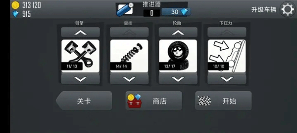 引擎:决定轮胎转速与基础速度。建议优先满足当前最高难度地图(如图中“最陡坡”)的通关需求即可,过高反而增加失控风险;沙漠、高速等长距离图需预留足够动力抵达下一个加油点。