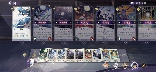 卡牌获取双轨并行:「秘闻卷」卡包(36勾玉/12000金币,首购金币优惠)随机产出单式神5张卡;「御札合成」则支持精准打造心仪卡牌(R/SR/SSR合成成本分别为95/950/4800御札)。分解重复卡牌可返还御札(R/SR/SSR分别得19/160/1500御札),形成健康循环。新手推荐优先通关剧情模式积累资源,分解低星废牌→合成实用R/SR卡→组建高性价比过渡卡组,稳步迈向天梯竞技舞台。