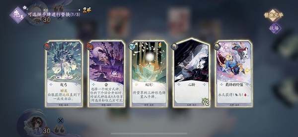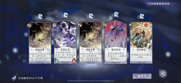 游戏卡牌分为三大核心类型:尖顶「战斗牌」提供额外攻击机会与属性强化(如犬神“恶即斩”增攻强攻);圆顶「形态牌」重塑式神形象与战力,覆盖属性并重置生命(兼具进攻、防御与回复功能);平顶「法术牌」则涵盖伤害、治疗、抽牌、觉醒等多元效果,其中「觉醒牌」可永久替换式神基础能力,气绝亦不丢失,战略价值极高。卡牌稀有度分R/SR/SSR三级,开包概率分别为60%/34.5%/5.5%,保底25包必得SSR。