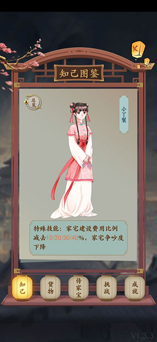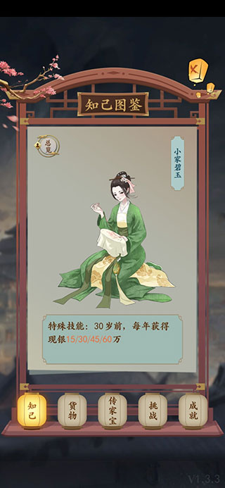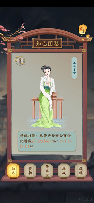 知己绝非装饰性角色——她们是真实影响你商业版图的核心变量。每位知己自带独特羁绊体系(天/地/人三阶),未激活羁绊时技能效果微弱,达成后则可大幅强化产业效率、市场洞察或奇遇概率;其子嗣属性倾向亦各不相同(如官运、商才、医术等),直接决定家族长期发展路径。迎娶门槛严苛且策略分明:有的需早年锁定,有的依赖产业等级(如驿站3级、书院4级),有的考验情绪管理(喜悦值达标)。合理规划迎娶节奏,等于提前十年布局你的“亿万商会”根基。
