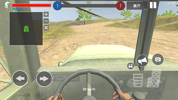 9、驾驶状态下,左侧箭头控制转向,右侧左侧为刹车、右侧为油门;另有鸣笛与拍照快捷按钮,如需下车,点击屏幕上方“离开”即可;