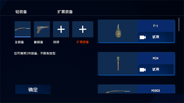 5、进入装备配置界面,依次选择主武器、副武器、投掷武器及其他扩展装备,完成搭配后点击“确定”;
