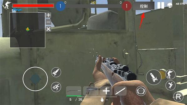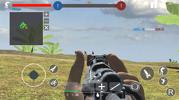 7、进入游戏后,使用左侧虚拟摇杆控制角色移动,滑动屏幕调整视角方向;右侧操作区从左至右依次为瞄准、开火、站立/下蹲切换、跳跃及换弹功能;