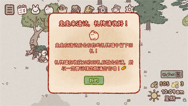6、兔兔来访时头顶会浮现爱心气泡,点击即可触发互动——别忘了收下它们悄悄放在木桩上的小礼物!