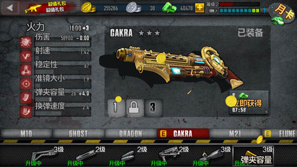 不同的武器所展现的伤害、射速、稳定性等属性各不相同,通过对枪托、枪口、子弹、枪身、准镜和弹夹容量进行改装升级,可大幅度提升武器的强度,这里武器可以通过礼包购买,也可以在商城中直接购买。