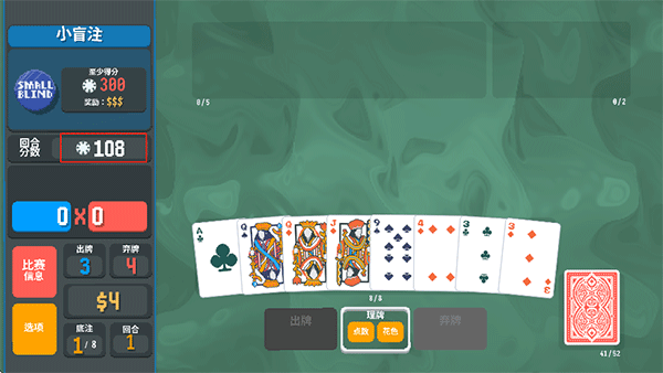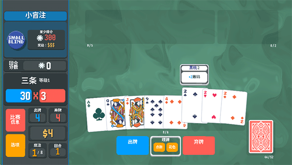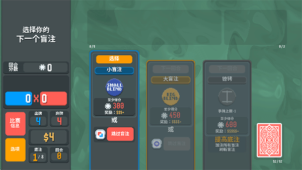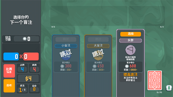 7、回合结束后若达成当前盲注分数目标,即判定为本局胜利;