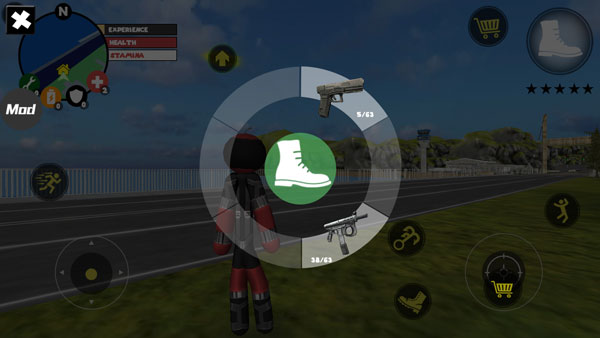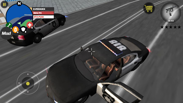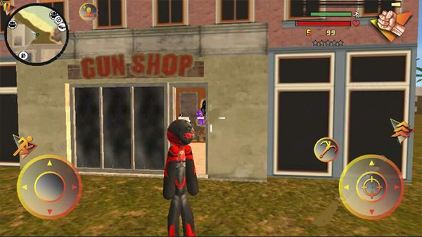 1、基础操作:屏幕左侧为虚拟摇杆,控制角色移动与加速;右侧区域集成绳索发射、普通攻击、跳跃三大核心功能;右上角实时显示武器切换按钮、当前血量及经验值,界面布局清晰直观。玩家可自由探索开放地图,与其他帮派成员展开交火——击杀敌人可获得经验,累积经验将提升星级,同时也会吸引警察及周边敌对势力的重点围剿,如何在高危环境中生存并高效清敌,是每一场对局的核心目标。