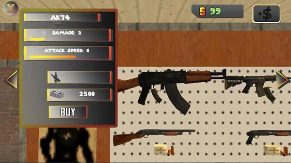 6、每种武器均明确标注名称、基础伤害、攻击速度、弹药容量及售价,例如AK74标价2500美金;