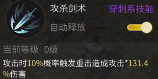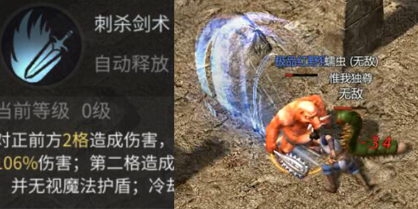 刺杀剑术:迅猛下劈式单体突进技,剑气覆盖前方两格范围,远格伤害更高且可无视法师职业的魔法护盾,是克制法师的关键手段。