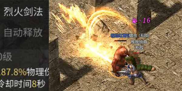 烈火剑法:高级单体爆发技,刀锋附带焚天烈焰,造成巨额伤害的同时具备概率无视魔法护盾特性,进一步强化对法师职业的压制力。