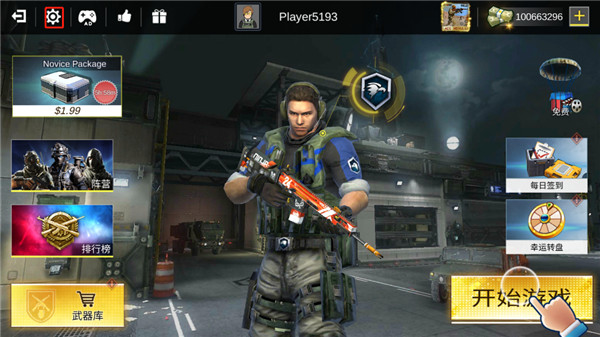 1、打开在本站下载的打击力量英雄,进入首页后可见阵营、排行榜、武器库等功能入口,建议优先点击右上角齿轮状设置按钮进行基础配置;