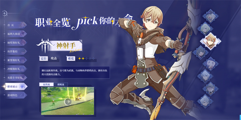 擅长远距离作战,以弓箭为武器。与动物伙伴协同出击,具备高机动性与大范围清场能力,适合应对群怪环境。