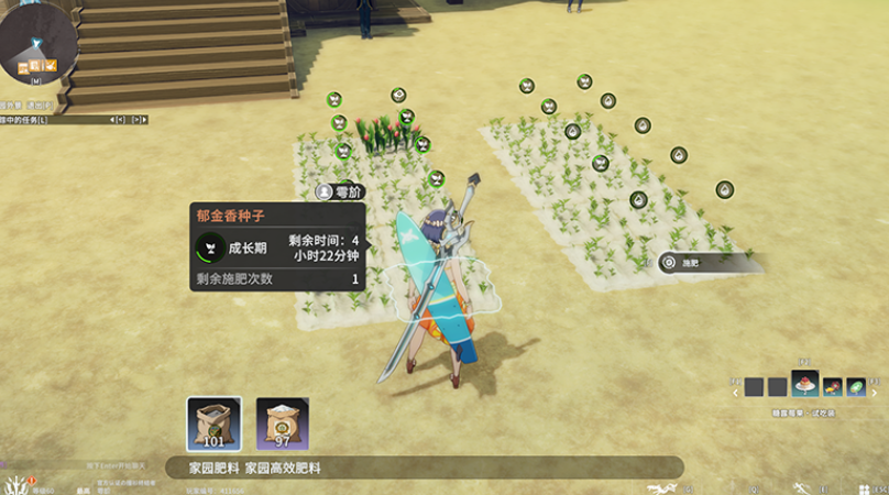 在「田地」中播种后,冒险者可通过浇水、施肥加速花卉生长,并借助授粉改变花卉性状,从而收获不同品种的成熟花朵。