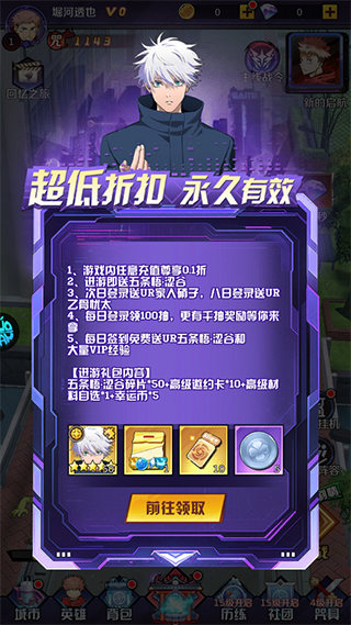 6、每日签到免费领取UR五条悟·涩谷及大量VIP经验,成长无忧;