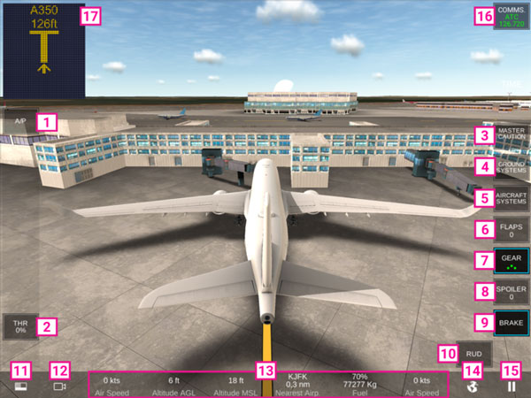 A/P - 自动驾驶仪开关|THR - 油门控制|地面系统|飞机系统|襟翼(FLAPS)|起落架(GEAR)|减速板(SPOILER)|刹车(BRAKE)|方向舵(RUD)|仪表面板切换|镜头自由旋转|面板指示器自定义|FMC航路图|暂停|无线电通讯(COMMS)|可视对接引导(VDGS)