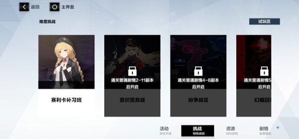 挑战关卡共五类:赛利卡补习班、意识营救战、纷争战区、幻痛囚笼、黄金之涡。以下为具体说明: