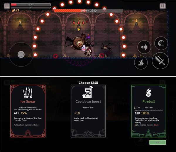 游戏以“跳跃+攻击+闪避”三位一体的操作体系为核心。地牢采用Roguelike结构,每次进入都会生成全新路径,玩家需在分支路线中做出抉择。操作简洁直观:方向键控制移动,单键集成跳跃、闪避、普通攻击与技能释放,上手容易但精通需策略。
