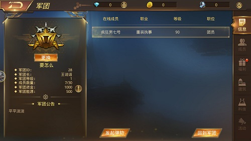 军团信息界面会显示军团战斗力、资金、科技等基本信息,在成员页签中还可以查看军团中所有的成员的在线状态,以及成员的等级、战力、职位、周活跃、总活跃等信息。军团管理可随时更换军团徽章,部分徽章需要激活才可以使用,所有军团成员均可购买激活徽章,激活后即可使用该徽章。
