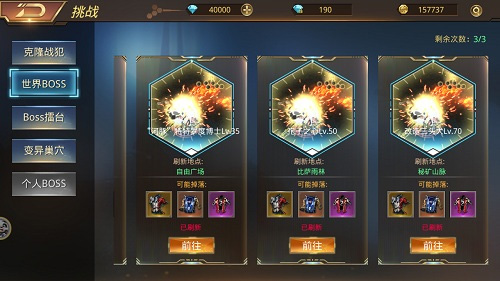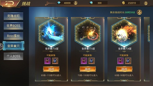 到达120级以上的玩家,推荐变异巢穴活动。游戏里的BOSS挑战活动之一,全天开放,分为不同的等级和难度,玩家可以点击界面上的挑战,选择合适的关卡。进入副本击杀怪物可获得紫色以上品级稀有装备。最后,各位玩家还要留意变异巢穴的挑战时间限制,只有在挑战时间内结束战斗才能获取奖励。