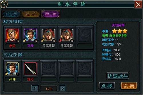 副本共设三种难度:普通、困难(精英)、噩梦(传说)。通关普通难度后解锁精英副本,通关精英后方可挑战传说难度。难度越高,经验奖励越丰厚,且高品质装备掉落概率大幅提升。特别值得注意的是,传说难度副本还有机会俘虏历史名将,为阵容增添强力战力。