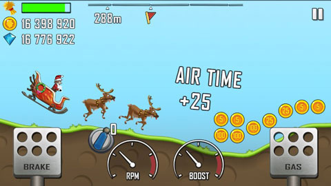 游戏采用双按钮操控:右侧为油门,控制前轮重心;左侧为刹车,调节后轮平衡。目标是在有限油量下尽可能跑得更远,同时收集沿途的金币与钻石。操作看似简单,实则对重心控制、节奏把握和路线选择有极高要求,极易上手却难于精通,让人一玩就停不下来。