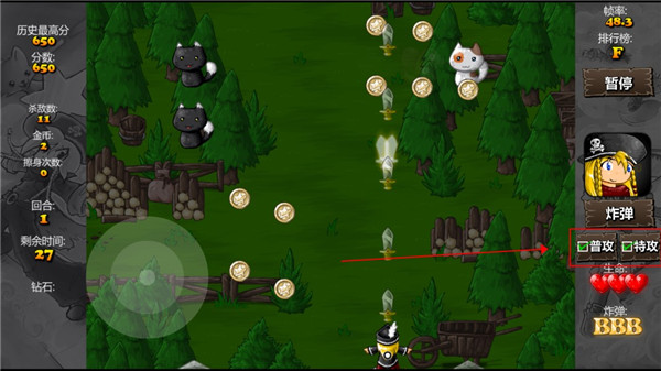 3、在游戏右边选择普攻和特效就可以开始自动攻击。