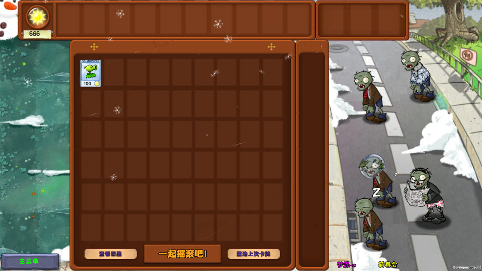 新春会:春节限定主题关卡,不仅植物发射带有节日元素的子弹,还会有舞龙僵尸等高难度敌人登场,营造出既喜庆又紧张的独特战斗氛围。