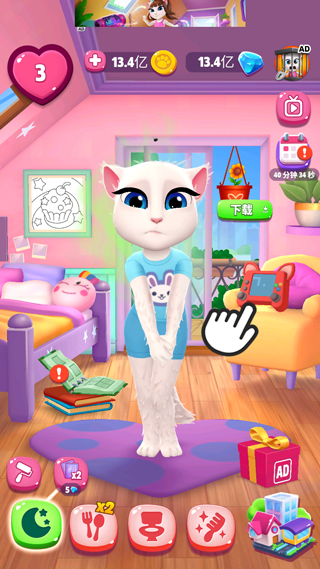 《我的安吉拉2》在保留经典喂食、洗澡、抚摸等基础互动的同时,大幅拓展了生活场景与自定义内容。你可以为安吉拉精心搭配服饰、设计发型、化上个性妆容,还能自由装修她的梦幻小窝。更令人惊喜的是,她不再局限于室内——现在可以带她外出旅行、烘焙甜点、登台跳舞、制作音乐,甚至参与各种迷你游戏,开启丰富多彩的虚拟人生。