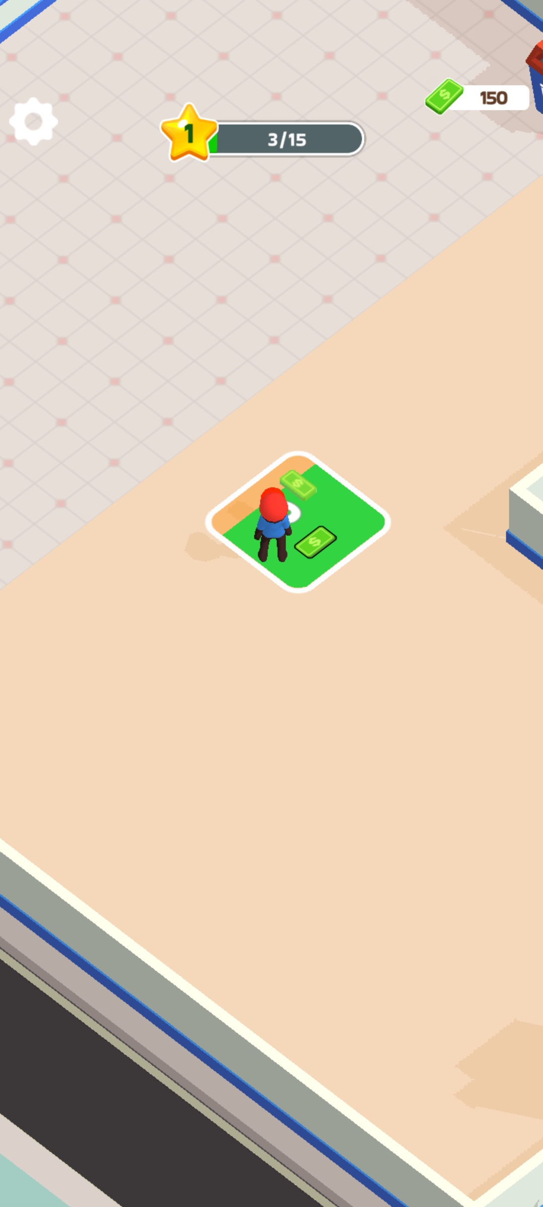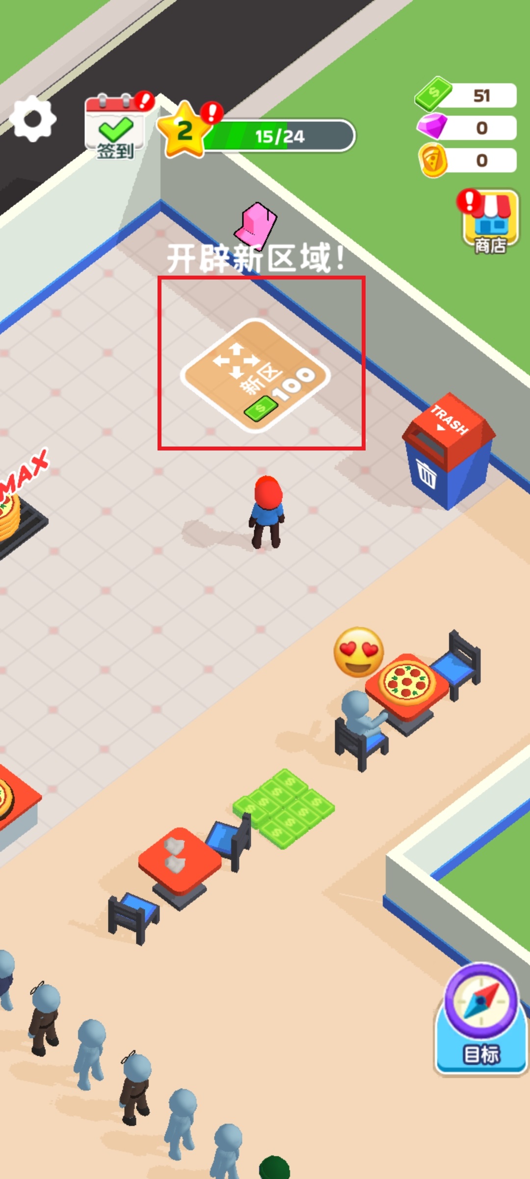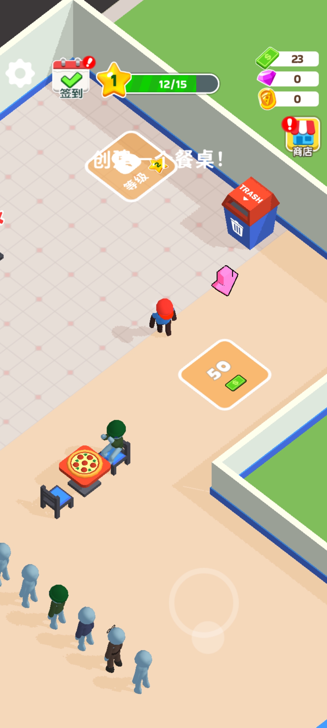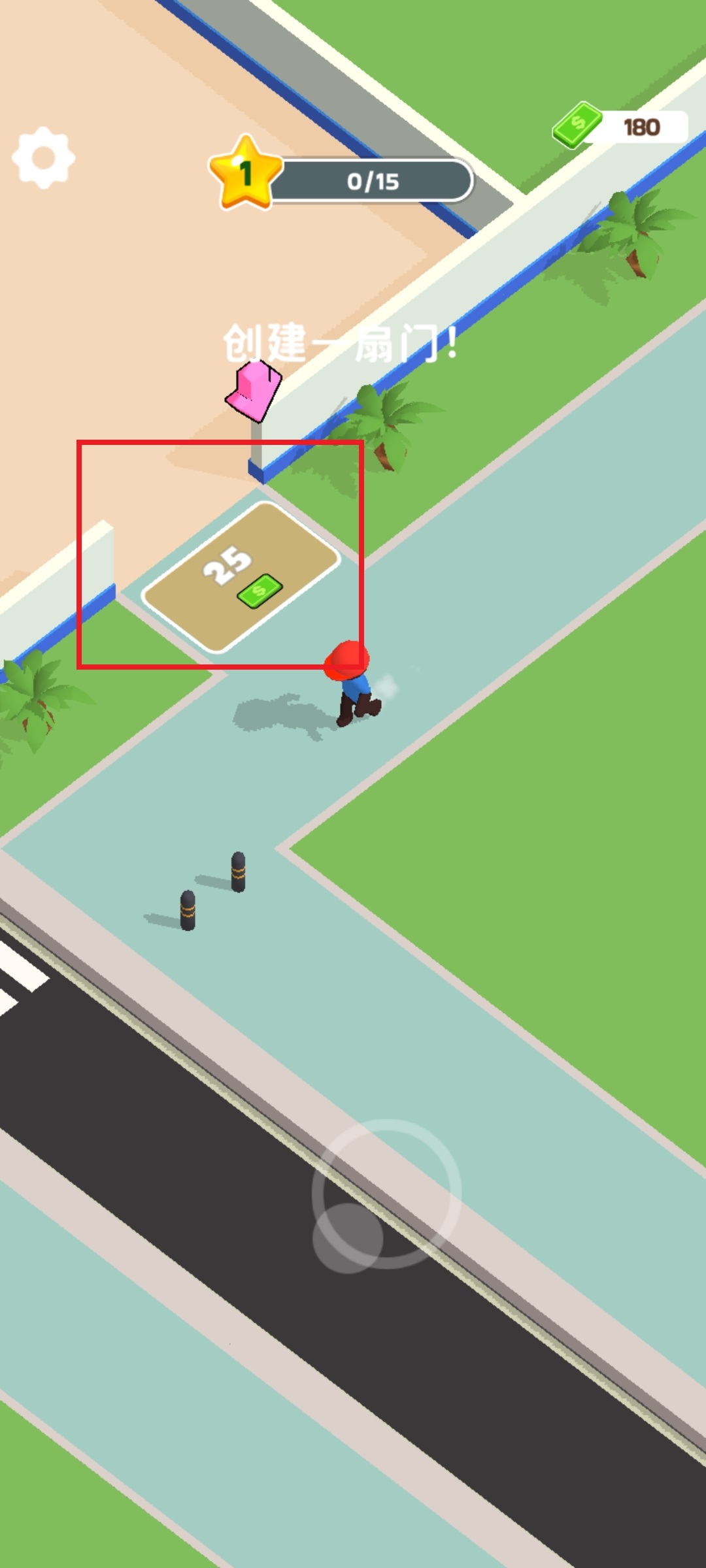 游戏初期,你需要先在门口拾取启动资金,随后在指定区域建造一扇门,为顾客提供入口。