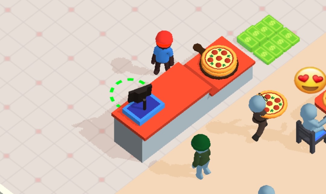 进入后厨区域,建造你的第一台披萨机,开始制作美味披萨。靠近成品即可自动拾取。