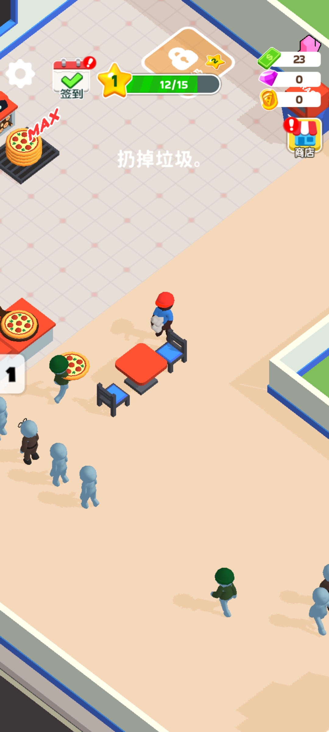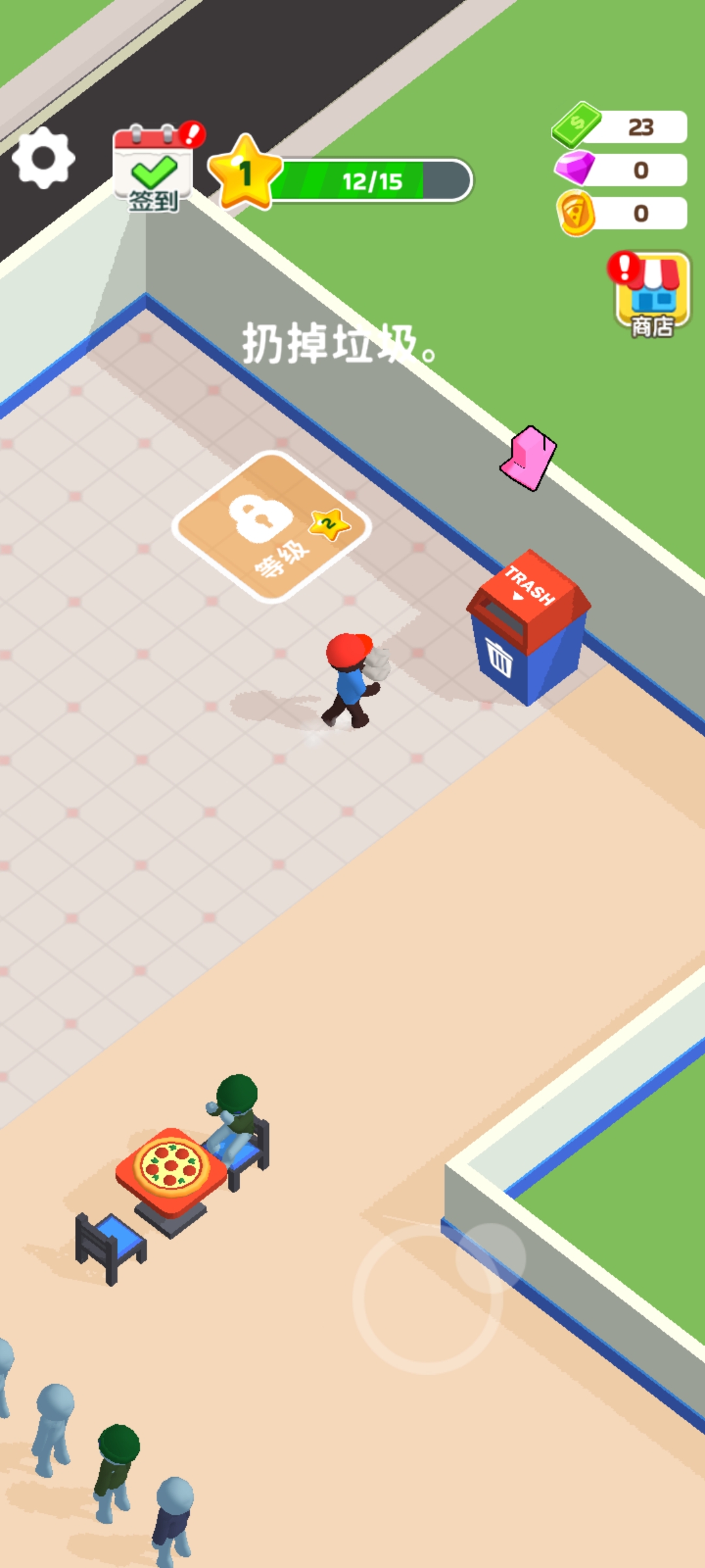 清理后的垃圾需前往店铺右上方的垃圾桶进行处理,维持卫生评分。