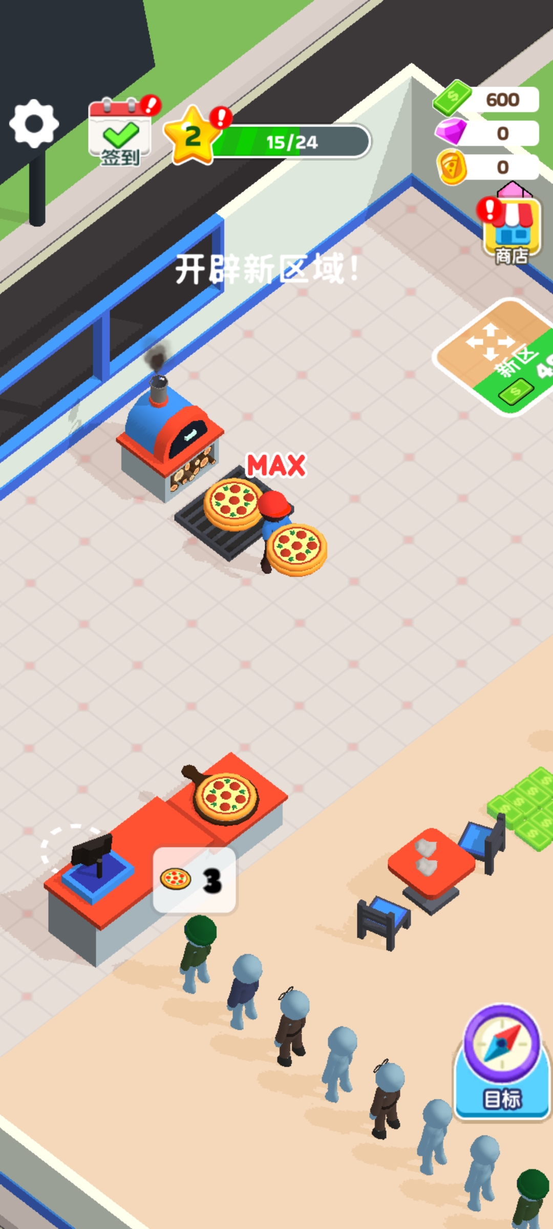 当店铺等级达到2级时,你将获得开辟新区域的权限,并领取额外启动资金,为扩张打下基础。