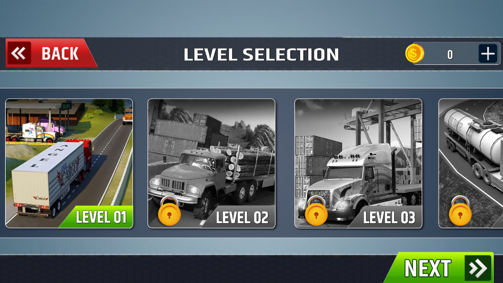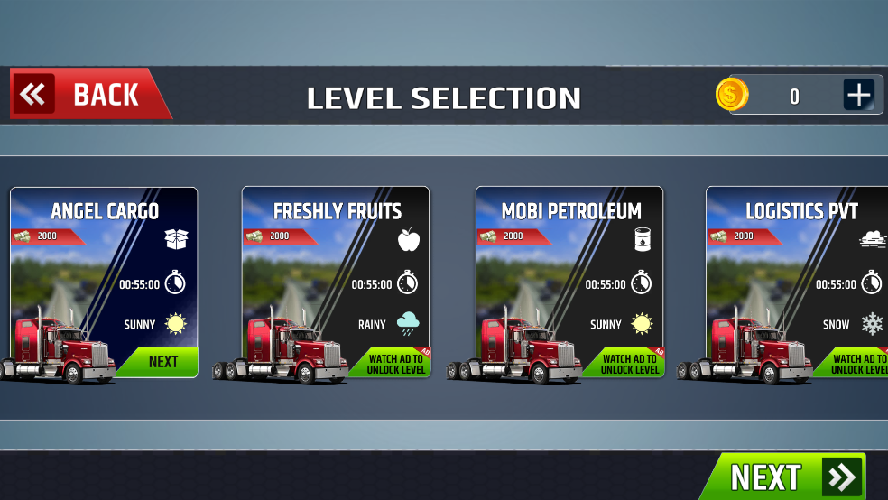 在越野模式中,你将面对一系列逐步解锁的高难度关卡。初始阶段仅提供基础车型,但随着任务完成并积累金币,可逐步购置性能更强、适应性更广的重型卡车。每次出车前需装载指定货物,点击“Start”即可启程。成功将货物安全送达目的地后,不仅能获得报酬,还能解锁下一关卡,持续推进你的职业司机生涯。
