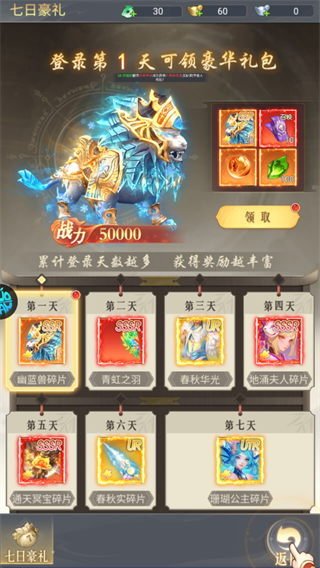 进入游戏后第一时间打开“七日豪礼”界面,立即领取第1天的豪华礼包,其中包含核心道具——幽蓝兽碎片加成材料,对前期战力提升至关重要。