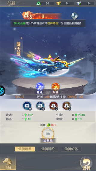 进入仙骑界面后,可查看初始仙骑“游天鲲”的属性详情。前期建议仅积累培养道具,暂不消耗资源进行升级。