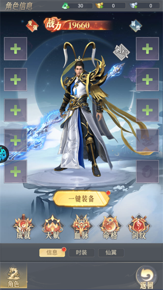 完成初始闯关后,进入角色信息界面,点击“一键装备”,系统将自动为角色穿戴已获得的装备,迅速提升初始战斗力。