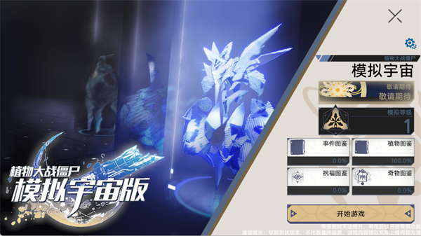 2、主界面中部分模式尚在开发中,玩家可先查阅事件图鉴、植物图鉴等资料。准备就绪后,点击【开始游戏】开启冒险之旅。