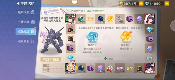 关键技巧:用50钻石购买一颗金骰子。当距离金骰子格<6步时,使用金骰子固定落点,可稳定获取两个金骰子;同理,接近扭蛋券格时也可操作,实现无限白嫖。大奖优先选择红精灵碎片(用于异界幻梦)。