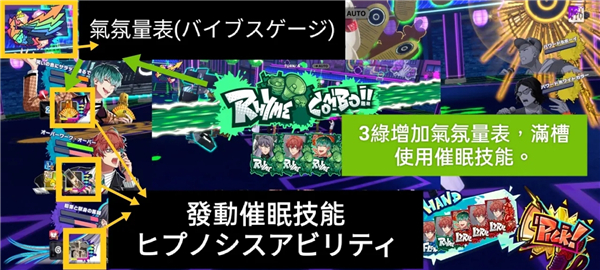 - **Rhyme(绿)**:填充“气氛量表”,满槽可使用“催眠技能”(ヒプノシスアビリティ),部分任务强制要求手动释放;